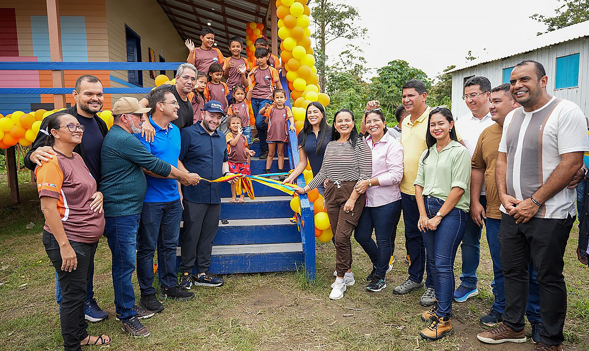 O deputado federal Fausto Júnior participou da inauguração de uma nova escola na comunidade São Vicente do Itaboraí, na zona rural de Parintins, ao lado do prefeito Mateus Assayag e da vice-prefeita Vanessa Gonçalves.
