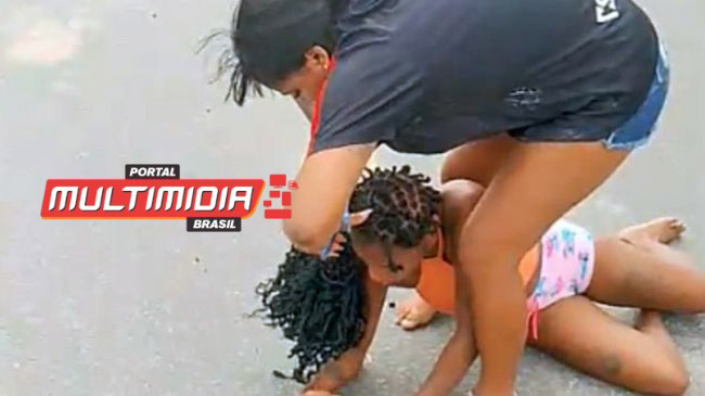 As imagens mostram a esposa puxando a amante pelos cabelos e, munida de uma tesoura, corta os cabelos e roupa da vítima.