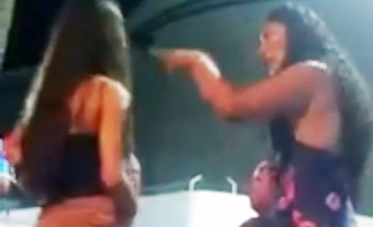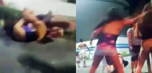 As duas rolam pelo chão, enquanto amigas tentam apartar a briga.